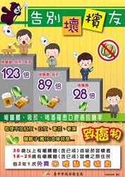 告別壞檳友 臺中市梧棲區衛生所 2026-03-16 世界衛生組織指出檳榔子本身即具有致癌性,即使不加紅灰、白灰、荖花、荖葉,光嚼檳榔就會致癌。研究顯示,嚼檳榔罹患口腔癌的機率是沒有嚼檳榔習慣者的28 倍,若嚼檳榔又吸菸,罹患口腔癌的機率則提高為 89 倍,如果吸菸、喝酒加上嚼檳榔,罹患口腔癌的機率則會提高至123倍! 符合以下資格的民眾,具每2年1次免費口腔黏膜檢查: (1)30歲以上有嚼檳榔(含已戒)或吸菸習慣者。 (2)18-29歲有嚼...