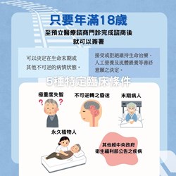 3. 預立醫療決定書內容 針對5種特定臨床條件下,經諮商過程選擇是否接受或拒絕維持生命治療、人工營養與流體餵養,於健保卡中註記。